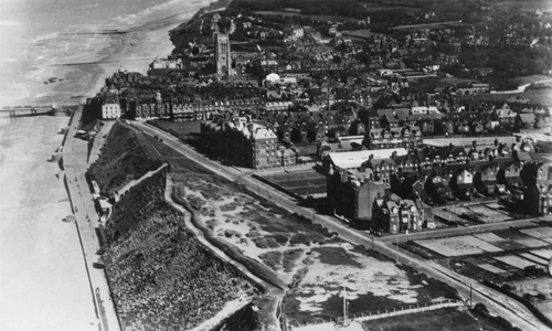 Perhaps the most obvious feature of this photograph is the open nature of the 'marrams' on the clifftop. The Grand Hotel stands with the White Steps in front, enabling their guests to reach the promenade. The sunken gardens would not be laid out until after the Second Waorl War and the putting green and the bowling green in the foreground are also yet to be laid out. The photo dates from the 1920s.