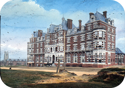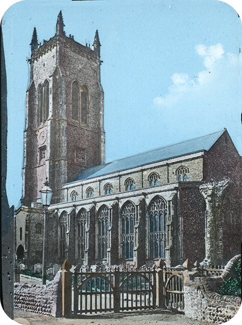 All slides of this type were taken as photographs, and a negative produced. The negative would of course have been on a glass plate. An enlarger - or perhaps we should in this case say a reducer - was used to print the picture as a positive on a three and a quarter inch glass plate. This image would be in black and white. Some lanternists would then hand colour their own slides; the Cromer collection seem to have been sent to Hughes, one of the lantern supply companies, for painting. The use of a professional company did of course result in a fairly standard form of painting on such slides - and occasionally the wrong colour being used. It also ensured that all the slide had nice blue skies!