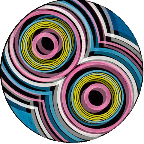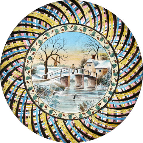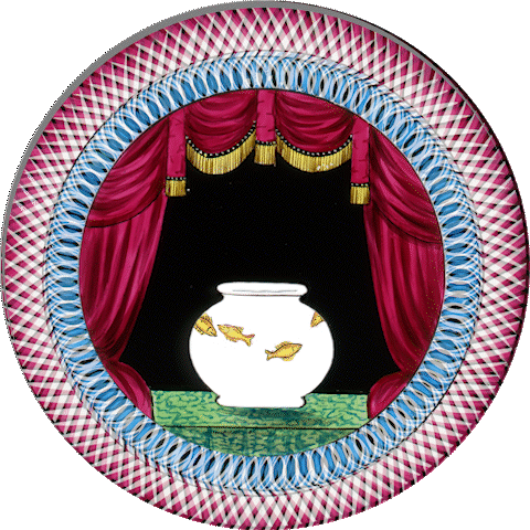 For this slide, the chromatrope is created around the edge of the image, with the circular patterned glasses also carrying the fish. A stationary slide holds the fish bowl and curtains.