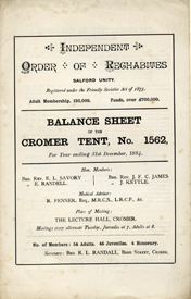 Some friendly societies subscribed to local hospitals, which enabled them to recommend their members for treatment. The IOR Cromer Tent paid an annual subscription of one guinea to Cromer Cottage Hospital, entitling them to recommend two people for admission in the year, "one for each half guinea".