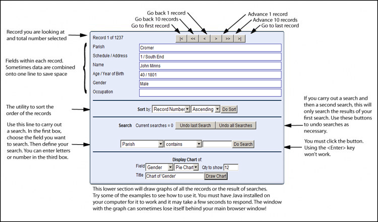 The first page in this section carries the data recorded when the census was taken in Cromer in 1841. The tools on the page enable you to analyse that data and draw conclusions from it.