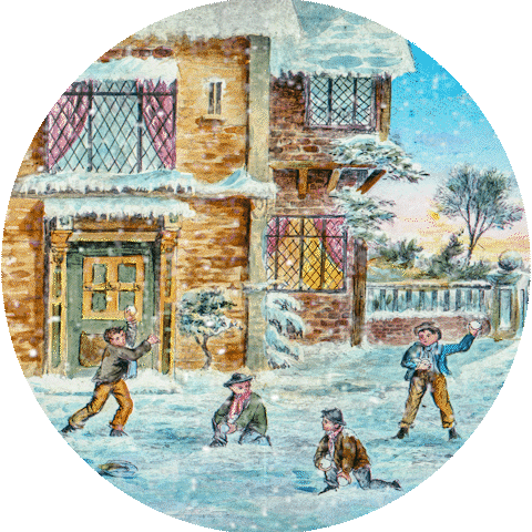 This scene of winter carolling is a combination of dissolving and slipping slides. The children snowballing dissolves into the evening scene of the house, then from the second lens of the biunial we overlay a slipping slide with the carol singers; this slide has a blackout over the door which, when pulled back, has the effect of opening the door. For this example, we've added falling snow from a roller blind. When projecting the slide from a lantern, it's important to fade out the snow before the snow roller runs out!
