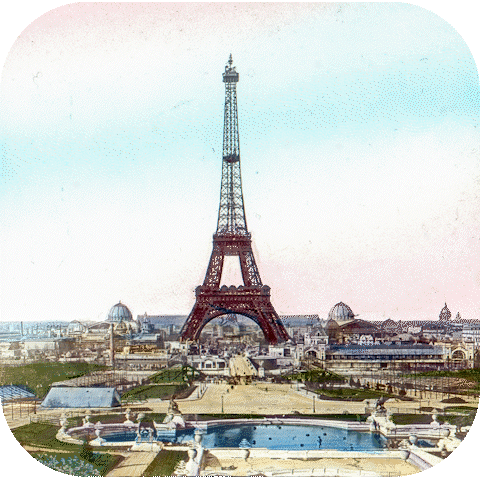 A three-slide dissolving set of the Eiffel Tower in Paris. The tower was completed in 1889, which helps us date both the slide and Mr Salter's catalogue to that year or possibly the following year. We can imagine that this set of slides was produced soon after the opening of the tower to illustrate tot he world the wonder of the huge structure.