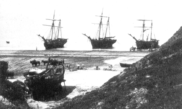 It's not always shown from the same view, so you may have to orientate yourself a little, but it shows the same plot of land. The sequence begins in a photo we can probably date to 1869, with coal ships sitting on the beach and a substantial vessel being repaired or built at the foot of the gangway. The 1863 boathouse may be just to the left of the picture; we can certainly see it in the next picture in the sequence.